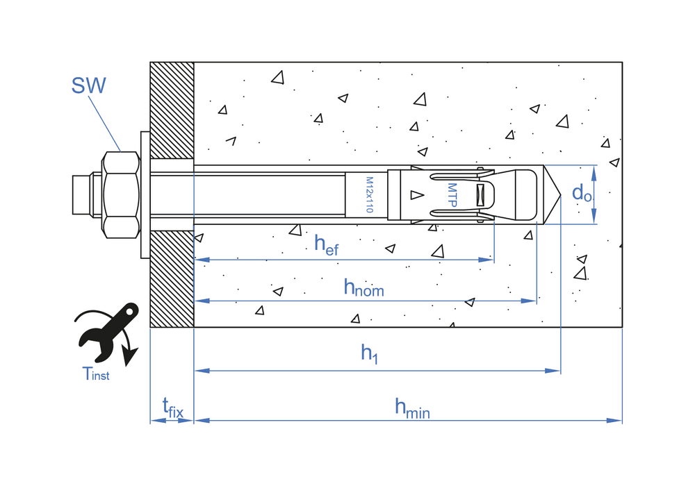 M8 x 75 Ø8 9 100 C 0 100 600 tfix - Max. fixture thickness 9 SW - Installation key 13 df - Ø Element to fix 9 Tins - Torque (Nm) 20 hef - Effective depth 48 hnom - Min. anchor depth 55 h1 - Drill hole depth min. 60 d0 - Ø Drill 8 hmin - Min. substrate thickness 100 L - Lenght 75 M8 x 95 Ø8 29 100 E 0 100 600 tfix - Max. fixture thickness 29 SW - Installation key 13 df - Ø Element to fix 9 Tins - Torque (Nm) 20 hef - Effective depth 48 hnom - Min. anchor depth 55 h1 - Drill hole depth min. 60 d0 - Ø Drill 8 hmin - Min. substrate thickness 100 L - Lenght 95 M8 x 115 Ø8 49 100 G 0 100 400 tfix - Max. fixture thickness 49 SW - Installation key 13 df - Ø Element to fix 9 Tins - Torque (Nm) 20 hef - Effective depth 48 hnom - Min. anchor depth 55 h1 - Drill hole depth min. 60 d0 - Ø Drill 8 hmin - Min. substrate thickness 100 L - Lenght 115 M10 x 90 Ø10 10 120 E 0 100 400 tfix - Max. fixture thickness 10 SW - Installation key 17 df - Ø Element to fix 12 Tins - Torque (Nm) 40 hef - Effective depth 60 hnom - Min. anchor depth 68 h1 - Drill hole depth min. 75 d0 - Ø Drill 10 hmin - Min. substrate thickness 120 L - Lenght 90 M10 x 105 Ø10 25 120 F 0 50 300 tfix - Max. fixture thickness 25 SW - Installation key 17 df - Ø Element to fix 12 Tins - Torque (Nm) 40 hef - Effective depth 60 hnom - Min. anchor depth 68 h1 - Drill hole depth min. 75 d0 - Ø Drill 10 hmin - Min. substrate thickness 120 L - Lenght 105 M10 x 115 Ø10 35 120 G 0 50 200 tfix - Max. fixture thickness 35 SW - Installation key 17 df - Ø Element to fix 12 Tins - Torque (Nm) 40 hef - Effective depth 60 hnom - Min. anchor depth 68 h1 - Drill hole depth min. 75 d0 - Ø Drill 10 hmin - Min. substrate thickness 120 L - Lenght 115 M10 x 135 Ø10 55 120 H 0 50 200 tfix - Max. fixture thickness 55 SW - Installation key 17 df - Ø Element to fix 12 Tins - Torque (Nm) 40 hef - Effective depth 60 hnom - Min. anchor depth 68 h1 - Drill hole depth min. 75 d0 - Ø Drill 10 hmin - Min. substrate thickness 120 L - Lenght 135 M10 x 165 Ø10 85 120 K 0 50 200 tfix - Max. fixture thickness 85 SW - Installation key 17 df - Ø Element to fix 12 Tins - Torque (Nm) 40 hef - Effective depth 60 hnom - Min. anchor depth 68 h1 - Drill hole depth min. 75 d0 - Ø Drill 10 hmin - Min. substrate thickness 120 L - Lenght 165 M10 x 185 Ø10 105 120 L 0 50 150 tfix - Max. fixture thickness 105 SW - Installation key 17 df - Ø Element to fix 12 Tins - Torque (Nm) 40 hef - Effective depth 60 hnom - Min. anchor depth 68 h1 - Drill hole depth min. 75 d0 - Ø Drill 10 hmin - Min. substrate thickness 120 L - Lenght 185 M12 x 100 Ø12 4 140 E 0 50 200 tfix - Max. fixture thickness 4 SW - Installation key 19 df - Ø Element to fix 14 Tins - Torque (Nm) 60 hef - Effective depth 70 hnom - Min. anchor depth 80 h1 - Drill hole depth min. 85 d0 - Ø Drill 12 hmin - Min. substrate thickness 140 L - Lenght 100 M12 x 110 Ø12 14 140 F 0 50 200 tfix - Max. fixture thickness 14 SW - Installation key 19 df - Ø Element to fix 14 Tins - Torque (Nm) 60 hef - Effective depth 70 hnom - Min. anchor depth 80 h1 - Drill hole depth min. 85 d0 - Ø Drill 12 hmin - Min. substrate thickness 140 L - Lenght 110 M12 x 120 Ø12 24 140 G 0 50 200 tfix - Max. fixture thickness 24 SW - Installation key 19 df - Ø Element to fix 14 Tins - Torque (Nm) 60 hef - Effective depth 70 hnom - Min. anchor depth 80 h1 - Drill hole depth min. 85 d0 - Ø Drill 12 hmin - Min. substrate thickness 140 L - Lenght 120 M12 x 130 Ø12 34 140 H 0 50 200 tfix - Max. fixture thickness 34 SW - Installation key 19 df - Ø Element to fix 14 Tins - Torque (Nm) 60 hef - Effective depth 70 hnom - Min. anchor depth 80 h1 - Drill hole depth min. 85 d0 - Ø Drill 12 hmin - Min. substrate thickness 140 L - Lenght 130 M12 x 150 Ø12 54 140 I 0 50 100 tfix - Max. fixture thickness 54 SW - Installation key 19 df - Ø Element to fix 14 Tins - Torque (Nm) 60 hef - Effective depth 70 hnom - Min. anchor depth 80 h1 - Drill hole depth min. 85 d0 - Ø Drill 12 hmin - Min. substrate thickness 140 L - Lenght 150 M12 x 180 Ø12 84 140 L 0 50 150 tfix - Max. fixture thickness 84 SW - Installation key 19 df - Ø Element to fix 14 Tins - Torque (Nm) 60 hef - Effective depth 70 hnom - Min. anchor depth 80 h1 - Drill hole depth min. 85 d0 - Ø Drill 12 hmin - Min. substrate thickness 140 L - Lenght 180 M12 x 200 Ø12 104 140 M 0 50 150 tfix - Max. fixture thickness 104 SW - Installation key 19 df - Ø Element to fix 14 Tins - Torque (Nm) 60 hef - Effective depth 70 hnom - Min. anchor depth 80 h1 - Drill hole depth min. 85 d0 - Ø Drill 12 hmin - Min. substrate thickness 140 L - Lenght 200 M16 x 145 Ø16 28 170 I 0 25 100 tfix - Max. fixture thickness 28 SW - Installation key 24 df - Ø Element to fix 18 Tins - Torque (Nm) 100 hef - Effective depth 85 hnom - Min. anchor depth 97 h1 - Drill hole depth min. 105 d0 - Ø Drill 16 hmin - Min. substrate thickness 170 L - Lenght 145 M16 x 175 Ø16 58 170 K 0 25 50 tfix - Max. fixture thickness 58 SW - Installation key 24 df - Ø Element to fix 18 Tins - Torque (Nm) 100 hef - Effective depth 85 hnom - Min. anchor depth 97 h1 - Drill hole depth min. 105 d0 - Ø Drill 16 hmin - Min. substrate thickness 170 L - Lenght 175 M16 x 220 Ø16 103 170 O 0 25 50 tfix - Max. fixture thickness 103 SW - Installation key 24 df - Ø Element to fix 18 Tins - Torque (Nm) 100 hef - Effective depth 85 hnom - Min. anchor depth 97 h1 - Drill hole depth min. 105 d0 - Ø Drill 16 hmin - Min. substrate thickness 170 L - Lenght 220 M20 x 170 Ø20 32 200 K 0 20 40 tfix - Max. fixture thickness 32 SW - Installation key 30 df - Ø Element to fix 22 Tins - Torque (Nm) 200 hef - Effective depth 100 hnom - Min. anchor depth 114 h1 - Drill hole depth min. 125 d0 - Ø Drill 20 hmin - Min. substrate thickness 200 L - Lenght 170 M20 x 200 Ø20 62 200 N 0 20 40 tfix - Max. fixture thickness 62 SW - Installation key 30 df - Ø Element to fix 22 Tins - Torque (Nm) 200 hef - Effective depth 100 hnom - Min. anchor depth 114 h1 - Drill 