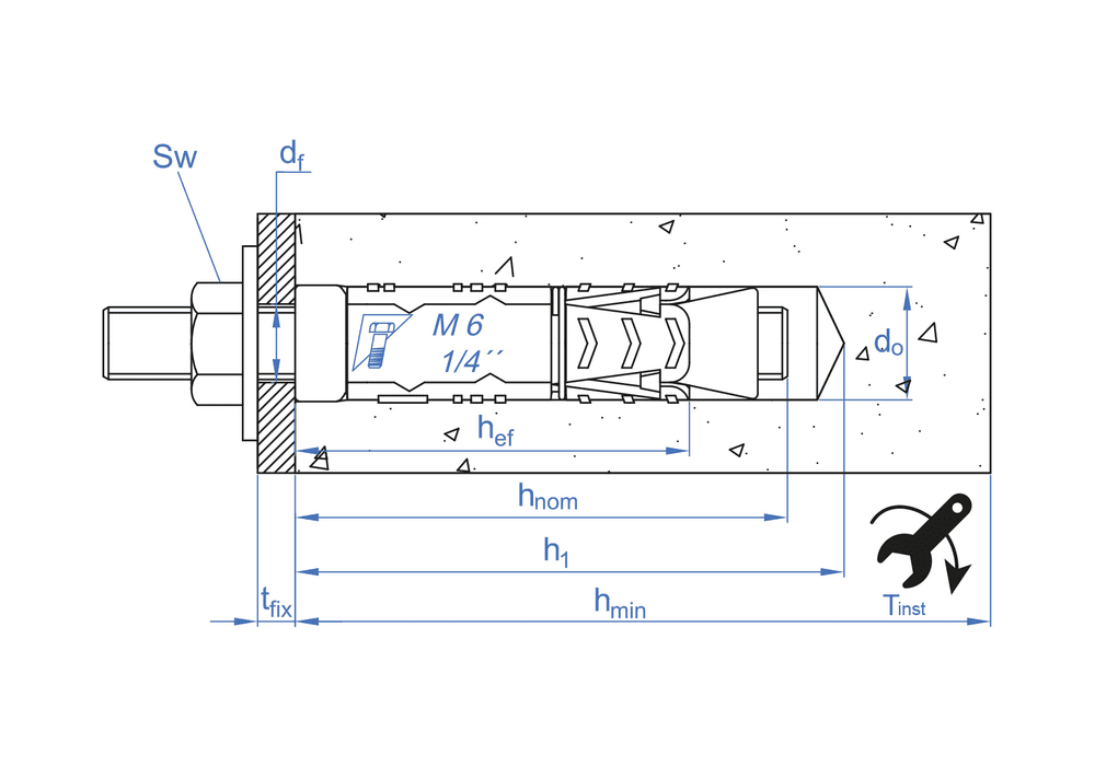 Zamak anchor for medium-heavy loads in hollow and solid elements. Projecting bolt